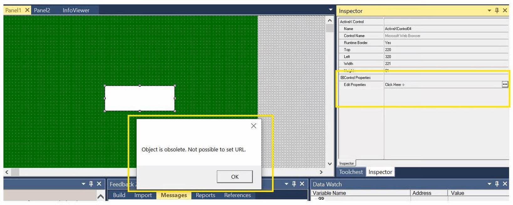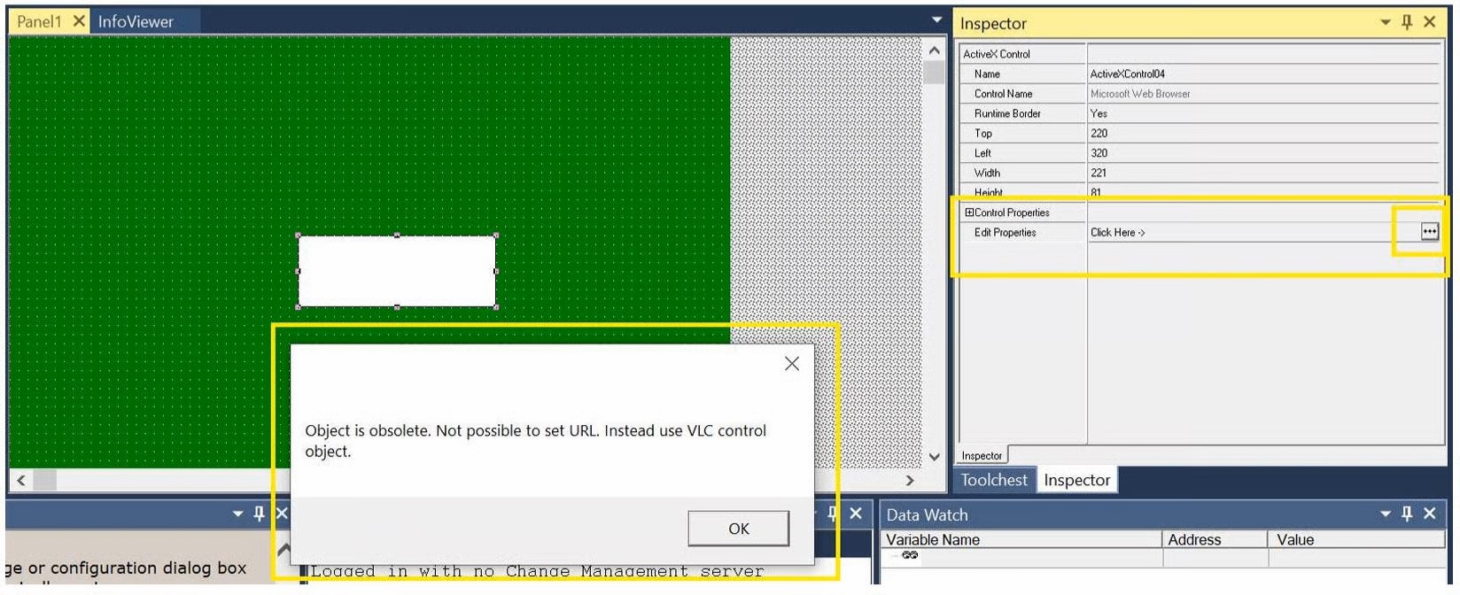 “Microsoft Web Browser” ActiveX Control is obsolete; the user cannot to set the URL when selecting the Microsoft Web Browser ActiveX control in the toolbox. If the “Microsoft Web Browser” ActiveX control object is added to the graphical panel of the Windows PC target, a dialogue message pops up when the user edits the URL. The popup dialog will display: Object is obsolete. Not possible to set the URL. Instead use VLC control object.